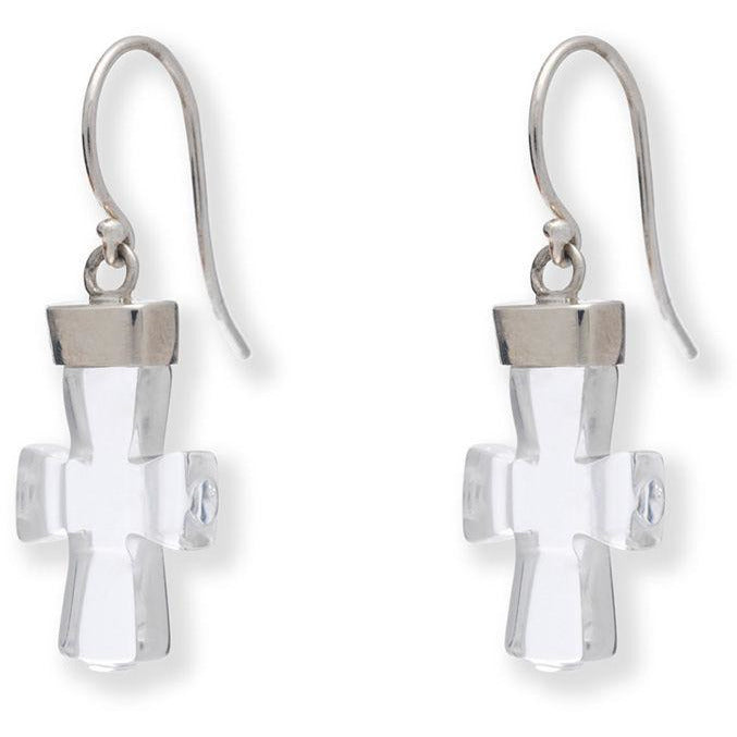 The Coptic Cross pierced earrings feature rock crystal crosses and have sterling silver wires. These dramatic earrings are made in the United States.