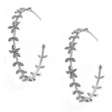 Leaves decorated with tiny cubic zirconia create a hoop earring with silver details.